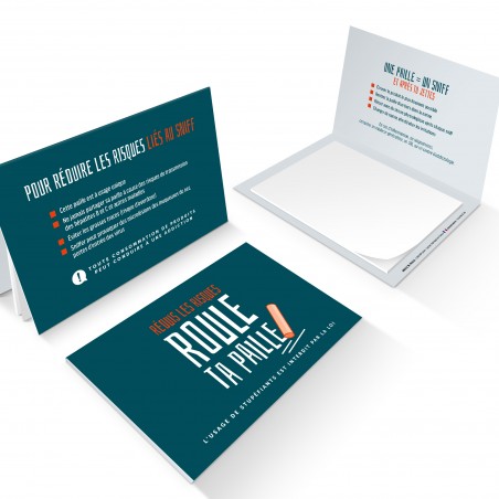 Les ROULE TA PAILLE se présentent sous la forme de carnet de 15 feuilles détachables prêtes à être roulées pour former des pailles destinées au sniff de produits psychoactifs. Leur distribution permet de promouvoir la paille à usage unique et la diffusion de messages de prévention pour une consommation à moindre risque.