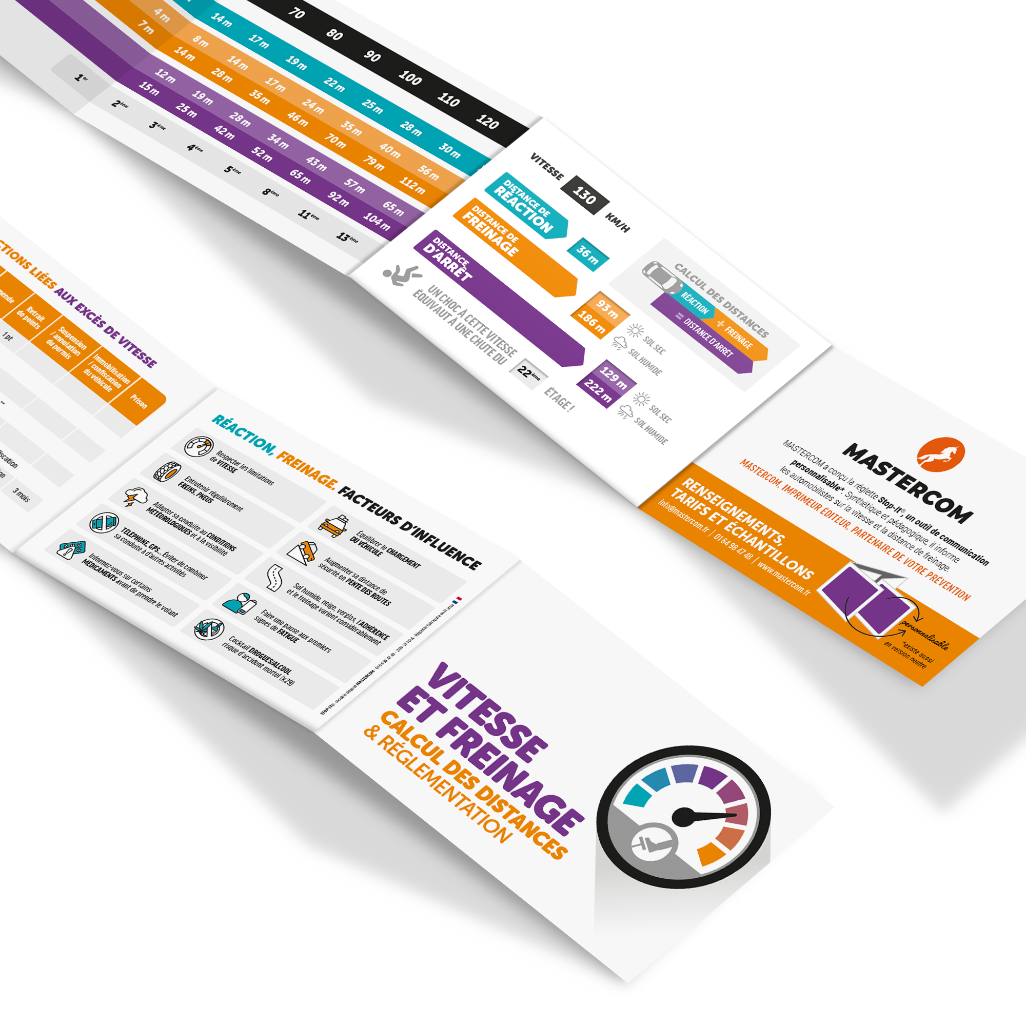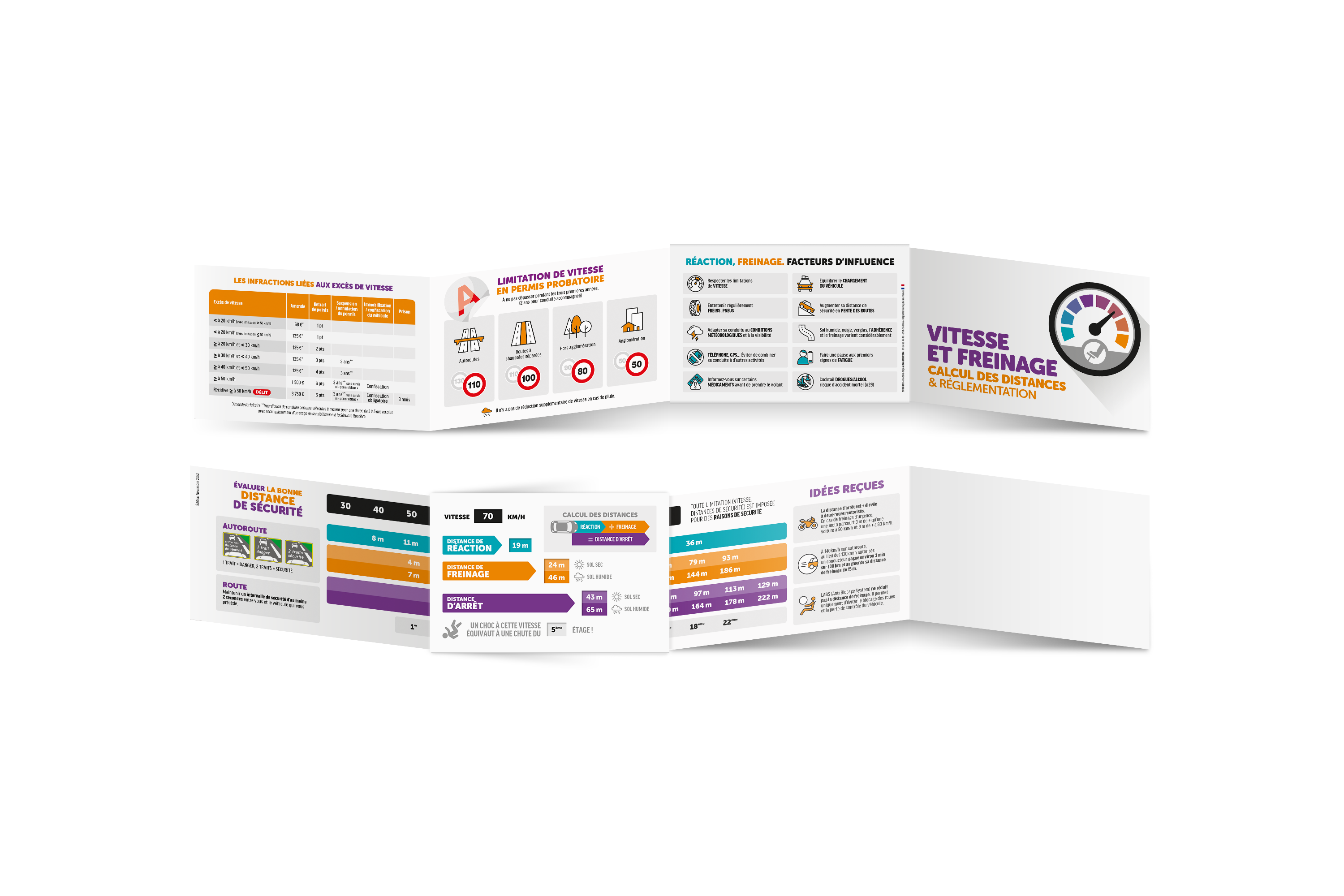 Réglette de calcul simple et immédiat du temps de réaction, de freinage et d'arrêt complétée de 4 volets de sensibilisation pédagogique.