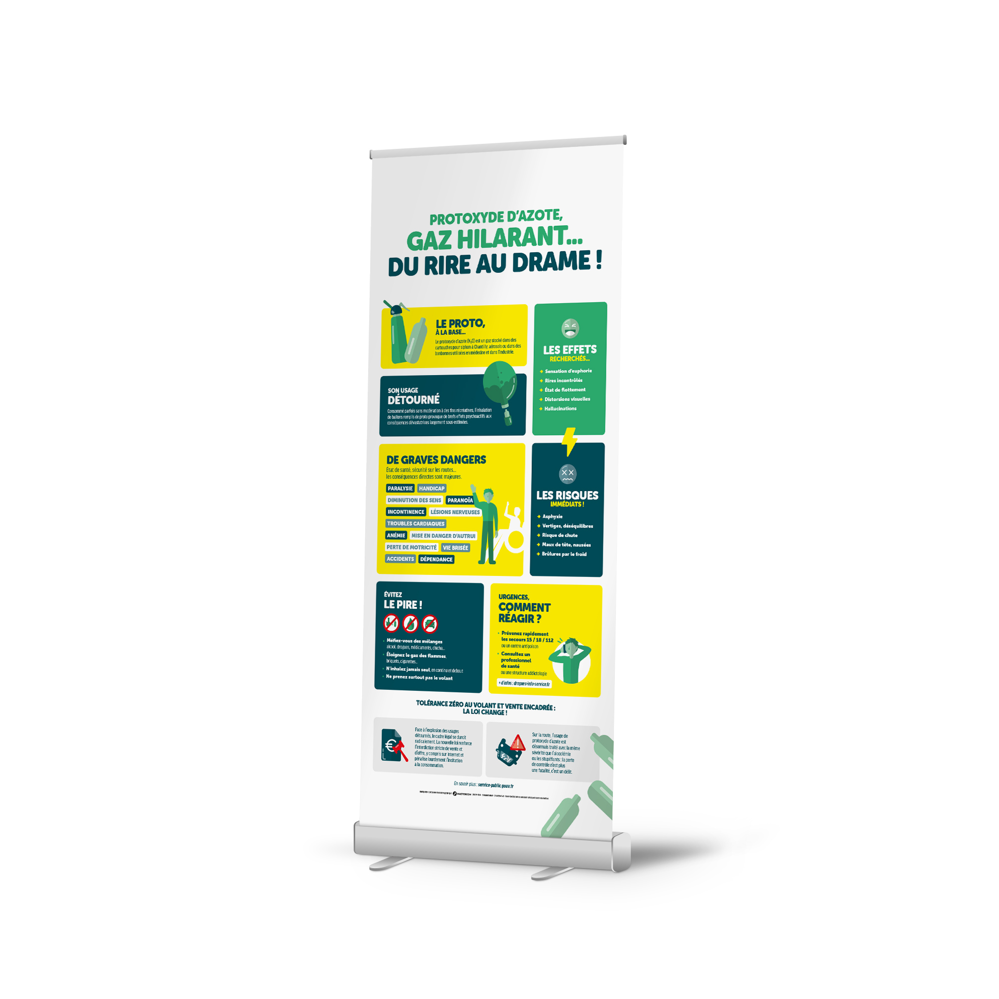 Support grand format pour la prévention de la consommation abusive du protoxyde d'azote, de ses risques pour la santé et la sécurité sur les routes.