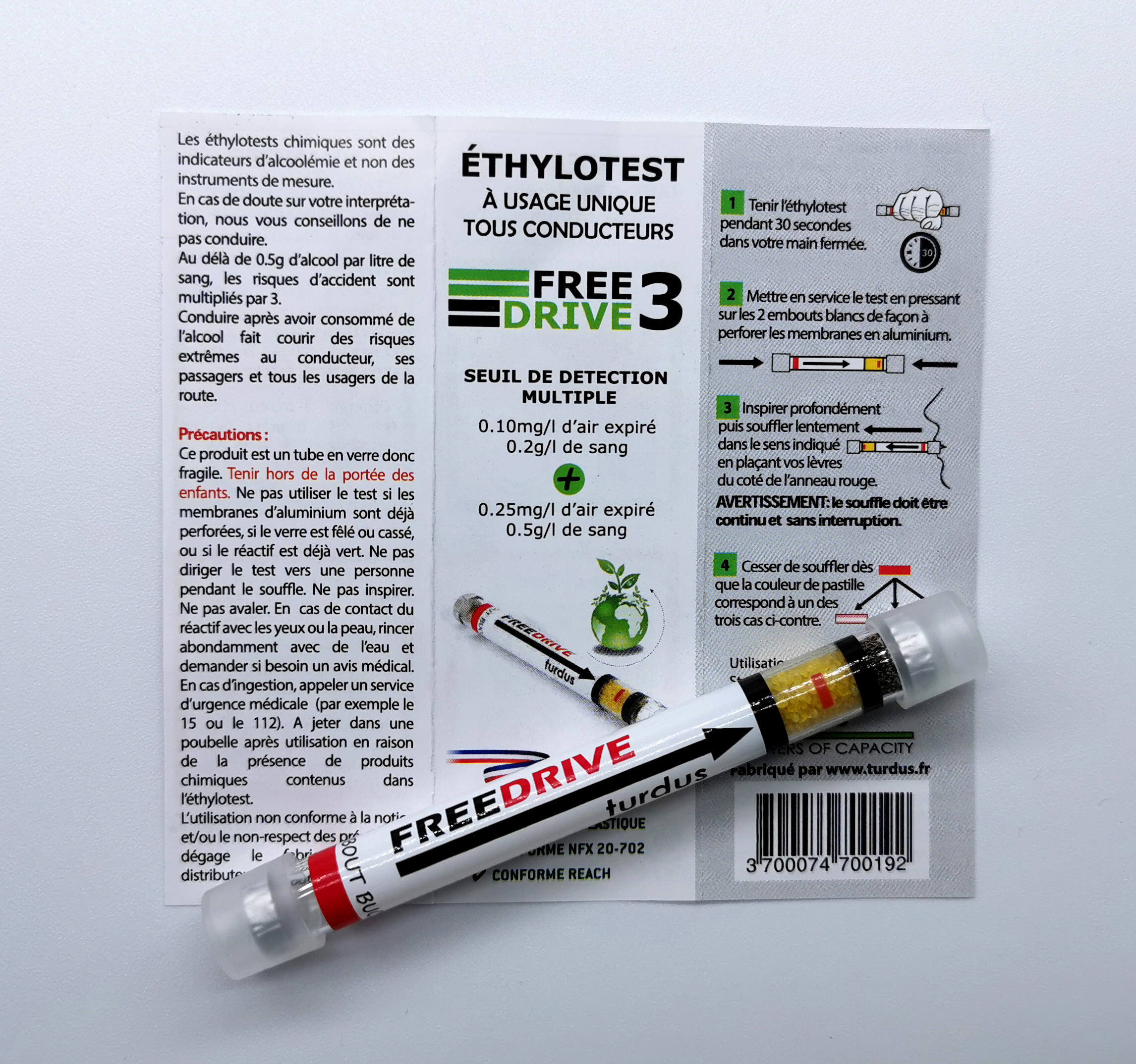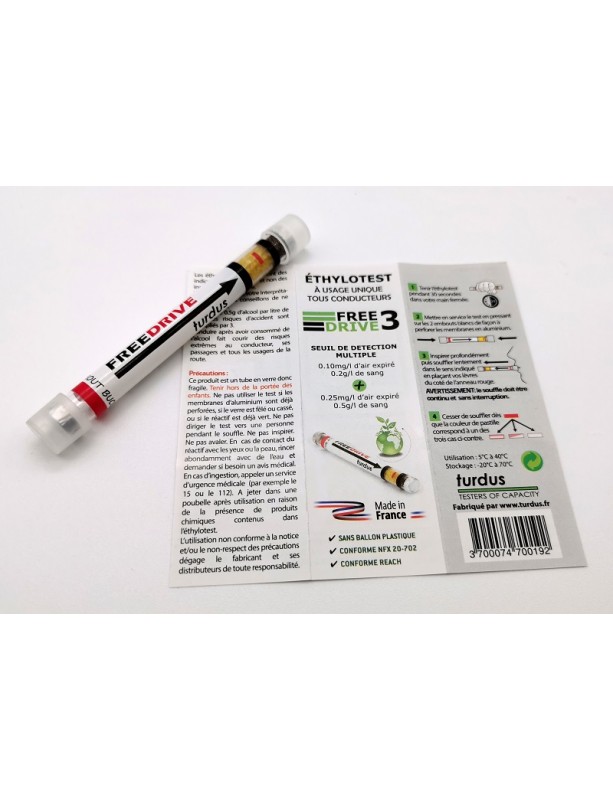 Éthylotest sans ballon Modèle Turdus - Fabrication Française - conforme au décret français 2015-775 - conforme à la norme NFX 20-702 et à la réglementation REACH - Date de Péremption inscrite sur le sachet d'emballage (24 mois)